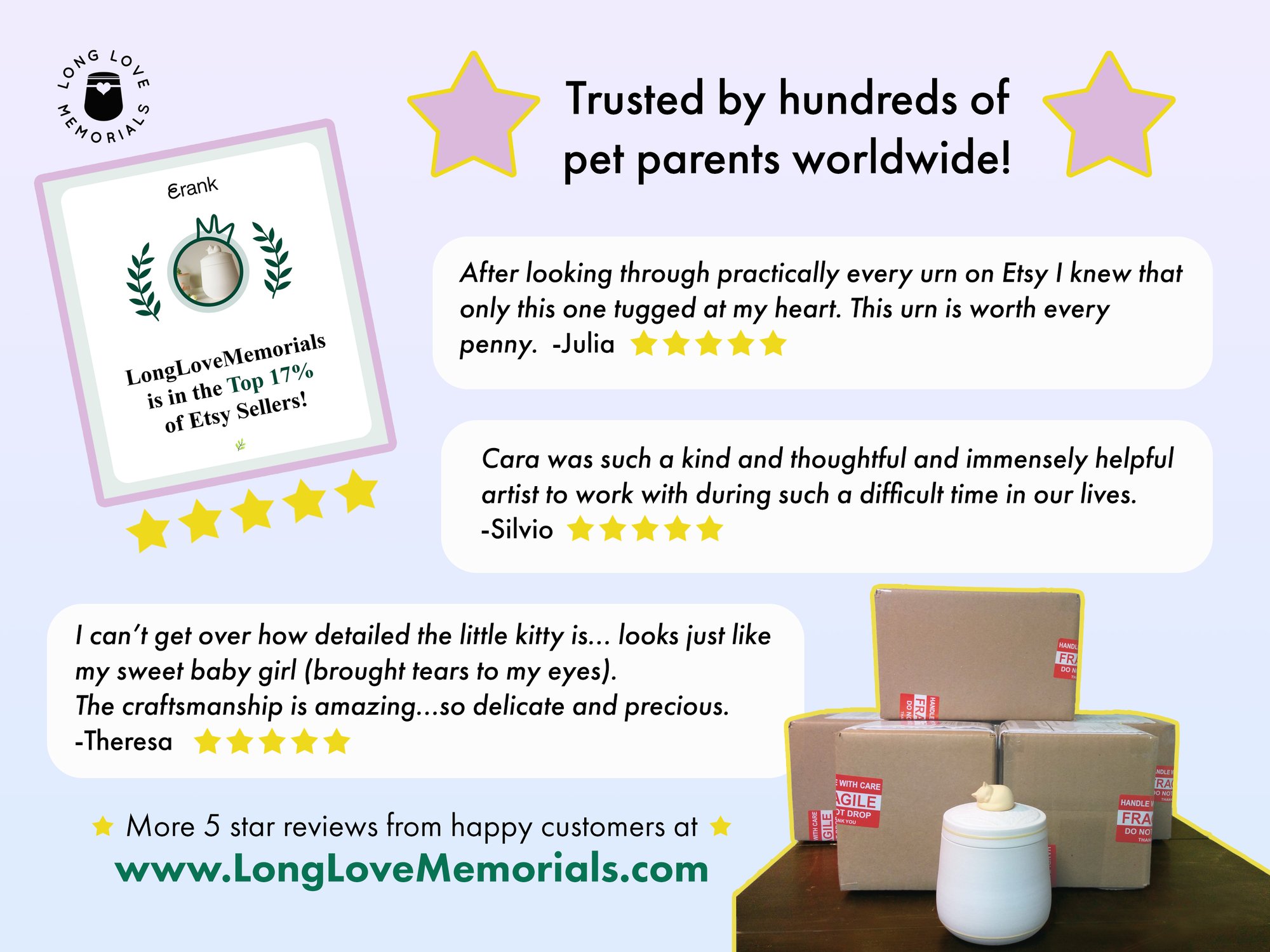 • Original urn designs you won't find anywhere else. We don't sell on Amazon, or Temu - only on Etsy and our own website (LongLoveMemorials.com)
