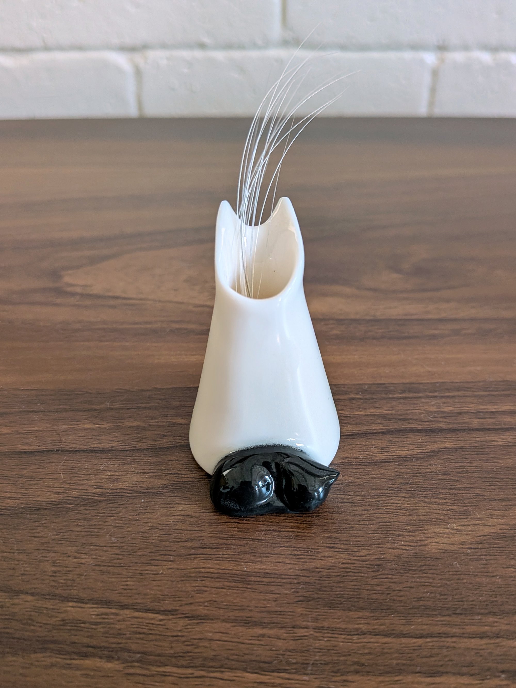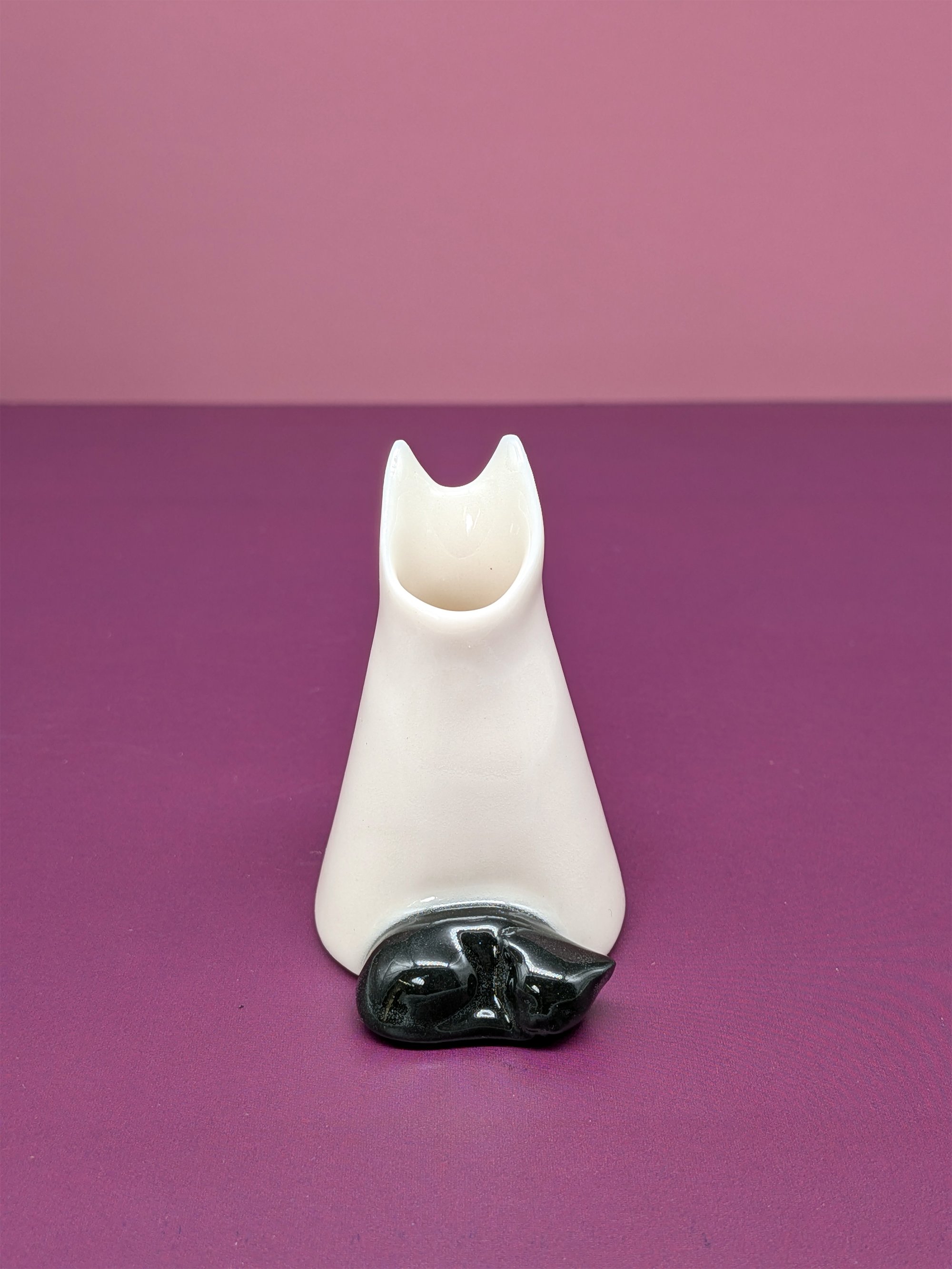 This is a little handmade cat whisker holder vase, to keep all of your cat's shedded whiskers safe. It's made by me from black and white porcelain, and clear glaze. It has a tiny black sleeping cat figurine at the base. The top rim is cut in the shape of cat ears, for added whimsy.